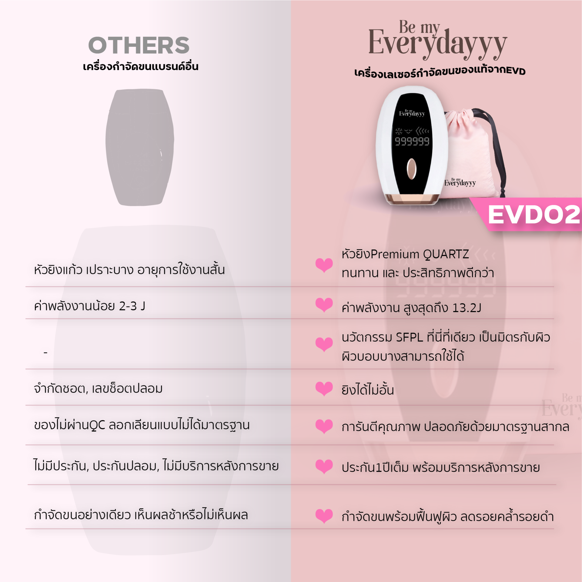 เมื่อซื้อสินค้าจากbemyeverydayyy ลูกค้าจะได้รับการรับประกัน1ปีกับตัวสินค้า ที่หากมีปัญหาสามารถส่งเปลี่ยนเครื่องใหม่ได้ทันที สินค้าจากทางร้านได้รับรองมาตรฐานสากลเนื่องเราต้องการมุ่งเน้นไปที่การใช้งานแบบไร้กังวล และปลอดภัยกับผิว รวมถึงองค์ประกอบทุกส่วนได้ถูกคัดเลือกและทดสอบมาแล้วว่าลูกค้าสามารถใช้ได้อย่างปลอดภัย มั่นใจ และเป็นมิตรกับผิวของเราอย่างแน่นอน เรื่องผิวสวยไร้ขนไว้ใจเราค่ะ